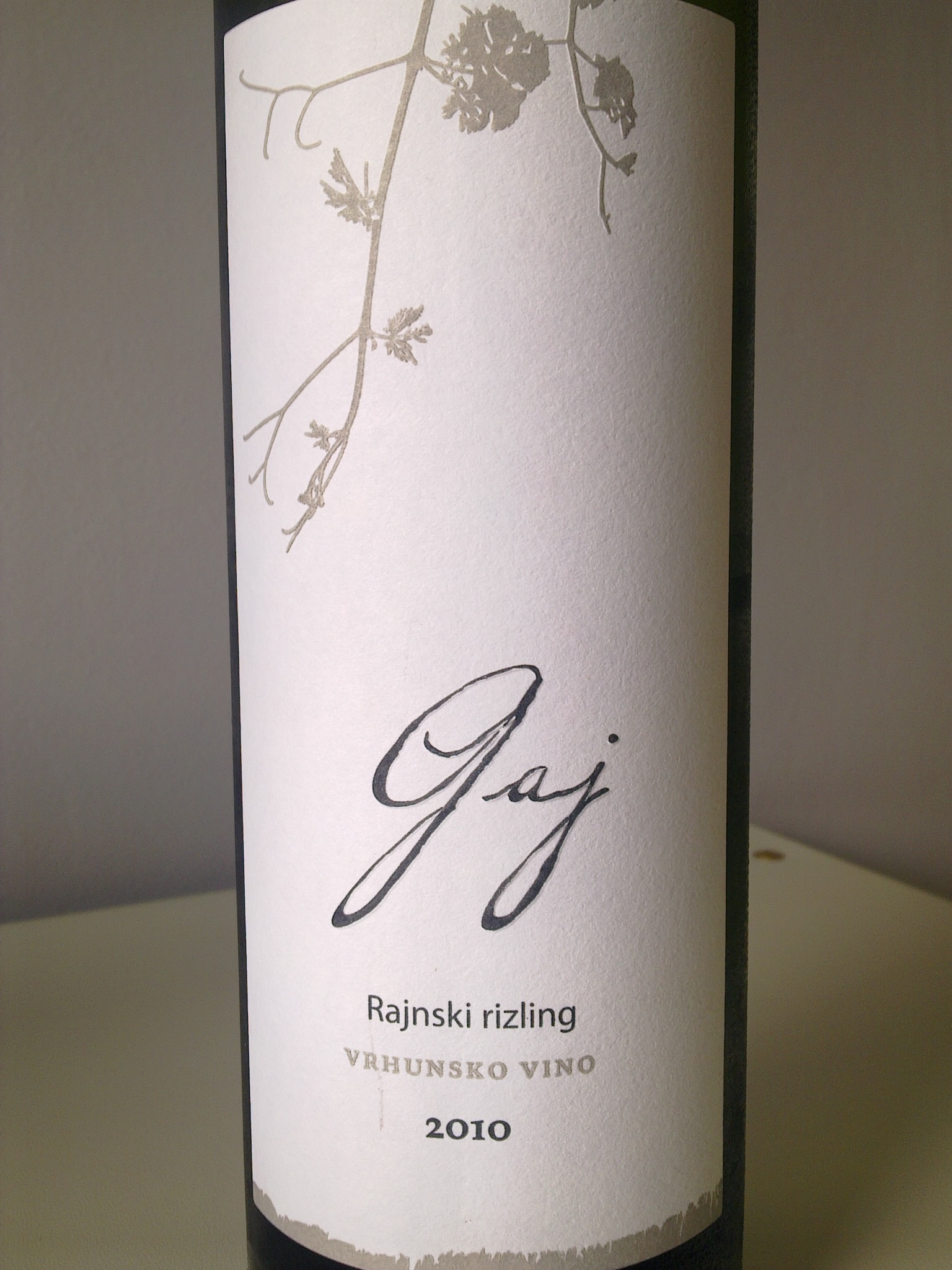 Nakon Sauvignona i Traminca, Rajnski Rizling iz podruma Mladine na Plešivici. Ovo vino sam dobio na nekom društvenom događaju i sjetio se poluslatkog Sauvignona berbe 2009. Svaka čast na hrabrosti. Sve u svemu, a obzirom na ono što pamtim od Mladine prije nekoliko godina… recimo da je Gaj stao tome na kraj 😉