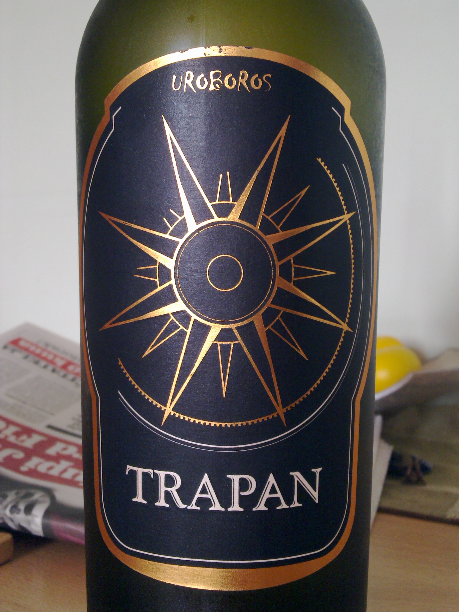 Trapanov Uroboros 2008. pokupio je Lovorike Vinistre 2010. To je bila čista Malvazija, dijelom mlada, dijelom iz akacije. Nisam je nikad probao. Slabo nešto trošim magnume 😉 S 2009. Trapan je odlučio eksperimentirati. Uroboros 2009. je 60% Chardonnay (!) i 40% Malvazija u kojoj je 20% Trapanove izvrsne bazne Malvazije Ponente, a ostalih 80% odležane u drvu akacije. Na vinu je provedena i malolaktična fermentacija.