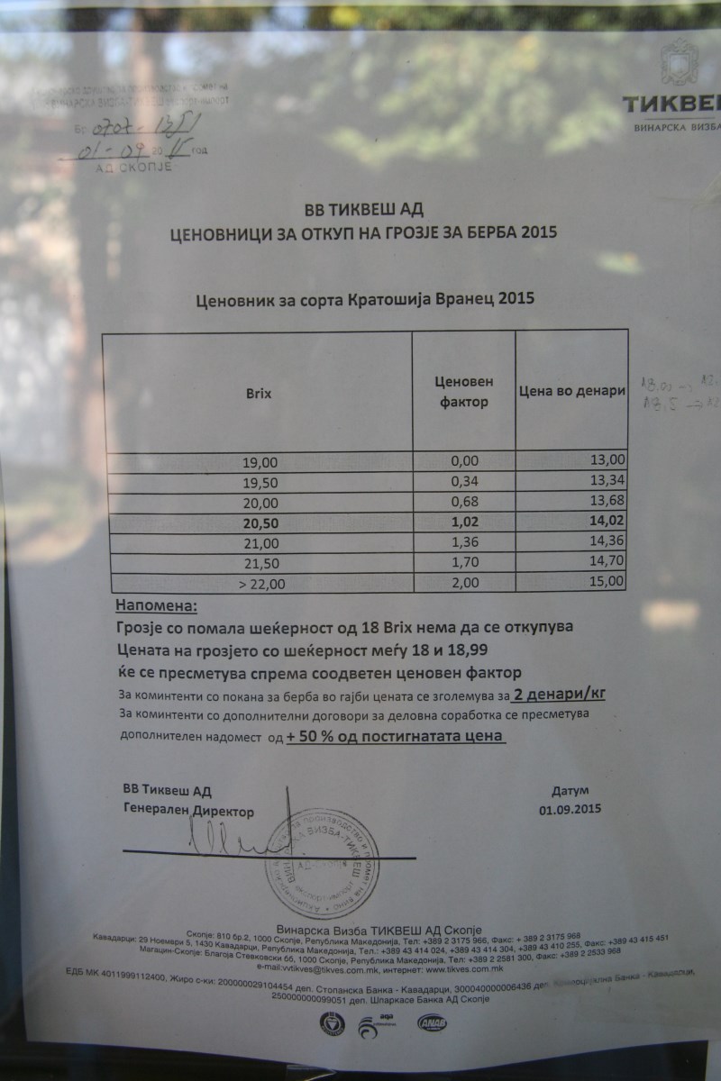 IMG_3591Boris Necev kao glavni enolog vinarije Bovin ove godine je dobio 50 tona grožđa za „igranje“. To je uobičajena praksa u velikim vinarijama. Čak i u malim se uvijek eksperimentira s određenom količinom uroda. Jedino što je tih 50 tona više nego što primjerice vinarija Korak ukupno preradi godišnje. A Bovin se ubraja u manje vinarije Makedonije. U danu kad smo posjetili Štip, u Ezimitu su zabilježili preradu milijun litara. U tom danu. Sve to je tričarija za Tikveš u kojem samo zaposlenici godišnje uz gablec popiju 150 tisuća litara 🙂 🙂 🙂